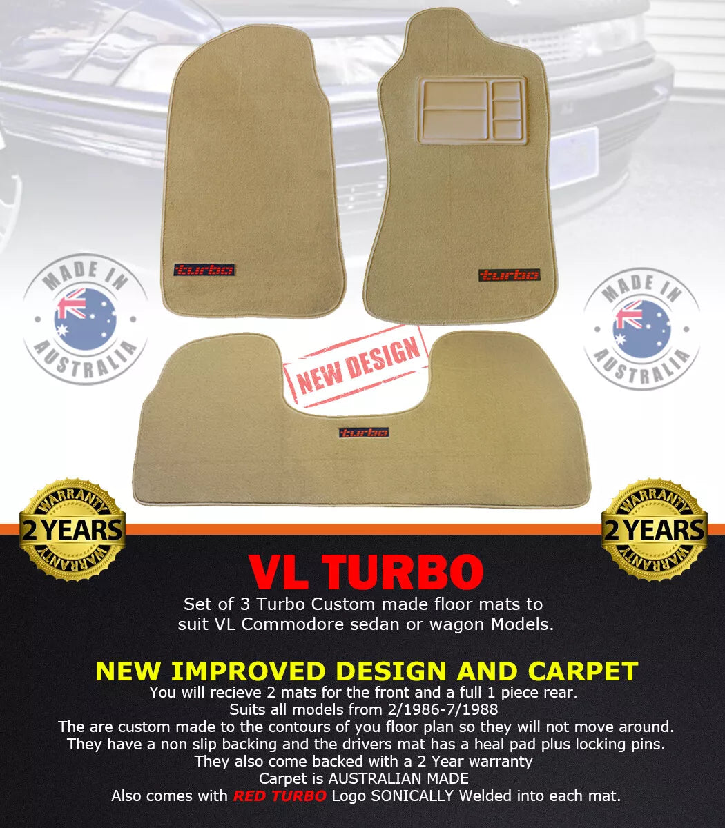You will receive a set of 3 Custom made mats to floors mats to suit VL Commodore.