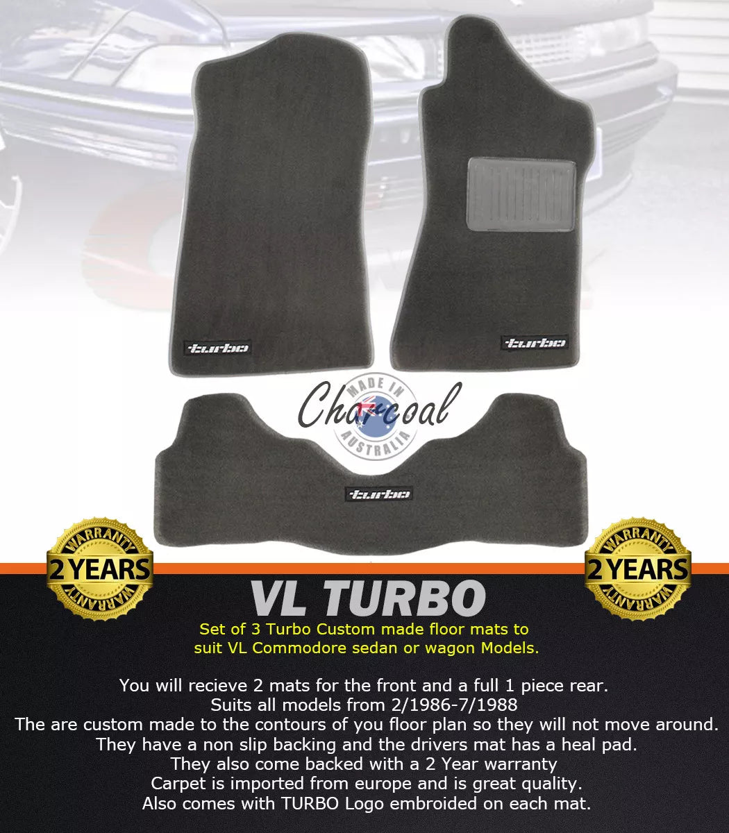 Custom Made Floor Mats Set of 3 Charcoal with Silver Badge VL TURBO Calais BT1