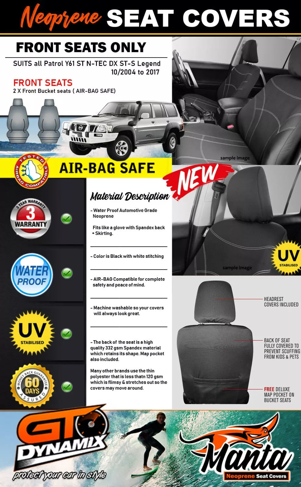 FRONT Manta Neoprene Seat Covers for Nissan Patrol Y61 ST DX ST-S Oct/2004-2017