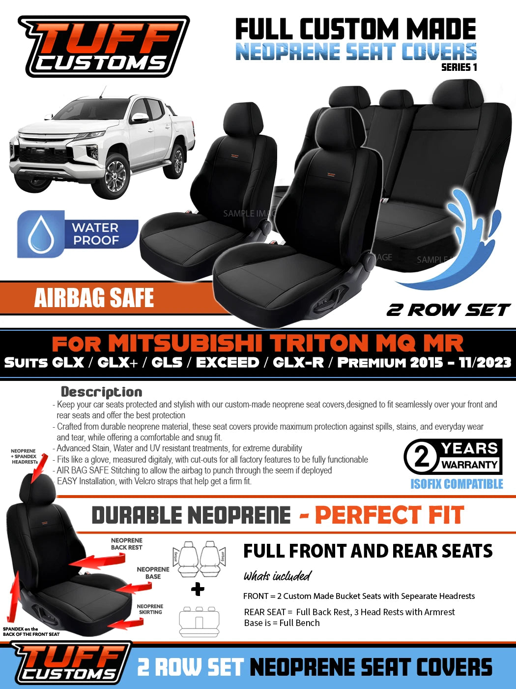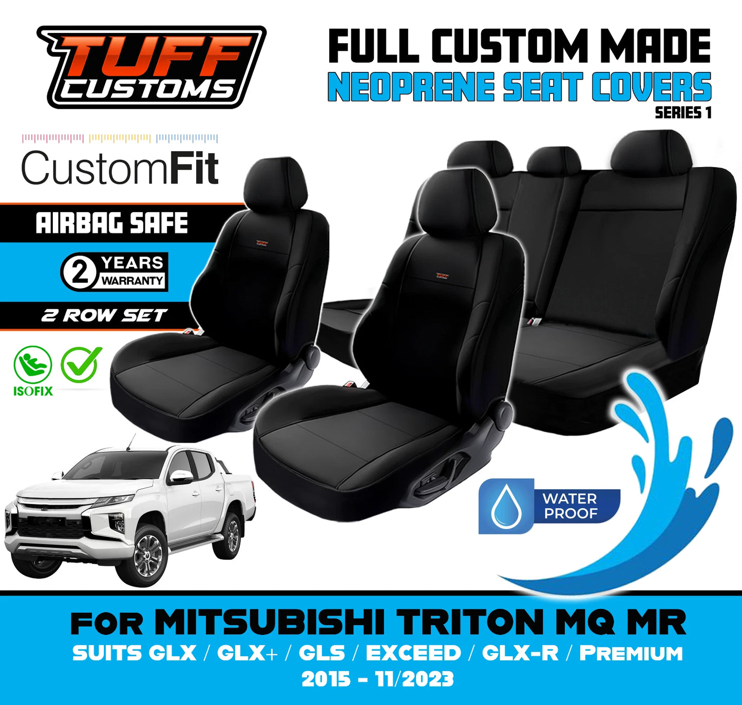 TUFF Customs S1 Neoprene Seat Covers 2 Rows For Mitsubishi Triton MQ MR Dual CAB GLS GLR GLX 1/2015-2023